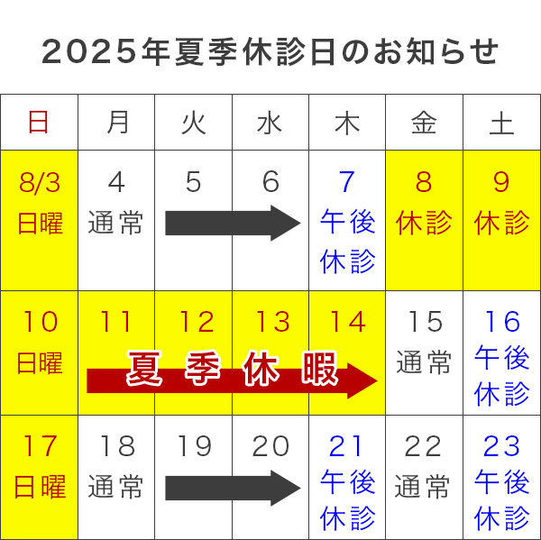 2025年 夏季休診のお知らせ 2025.07.30 8/8〜8/14は夏季休診期間です。 お薬や診察をご希望の方はご注意ください。 ※8月23日(土)は「午後休診」の誤りで、通常どおりの診療を行っております。 Post Share Hatena Pocket RSS feedly Pin it 健康診断について前の記事 2025年10月からのインフルエンザ、コロナワクチンのお知らせ次の記事