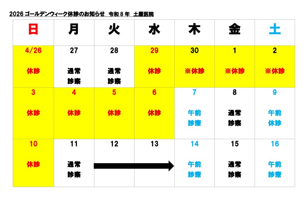 2026年GWの休診日について 2026.04.13 2026年GWの休診日は以下の通りです。 Post Share Hatena Pocket RSS feedly Pin it 令和7年度年末年始休診日のお知らせ前の記事 自動受付機・精算機の導入について次の記事